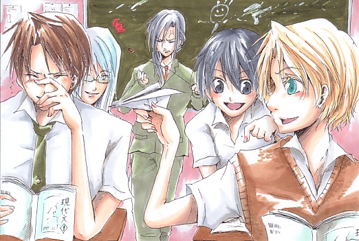 密かなるお気に入りです。 席が有利とコンラッド隣なことに 深い意味はありません(笑) 国語の教科書表紙反対じゃない? とかそういうツッコミはなしでお願いしますorz 別にコンラッド一人でいいギャグ思いついたから 笑ってるわけじゃあないです。 コンラッドの後ろにいるのは 幽霊なんかでもありません。 グウェンの指示棒曲がってるのは 人の殴りすぎです。 注意しすぎです。 …と考えていくと激しく協調性の無い絵だ…